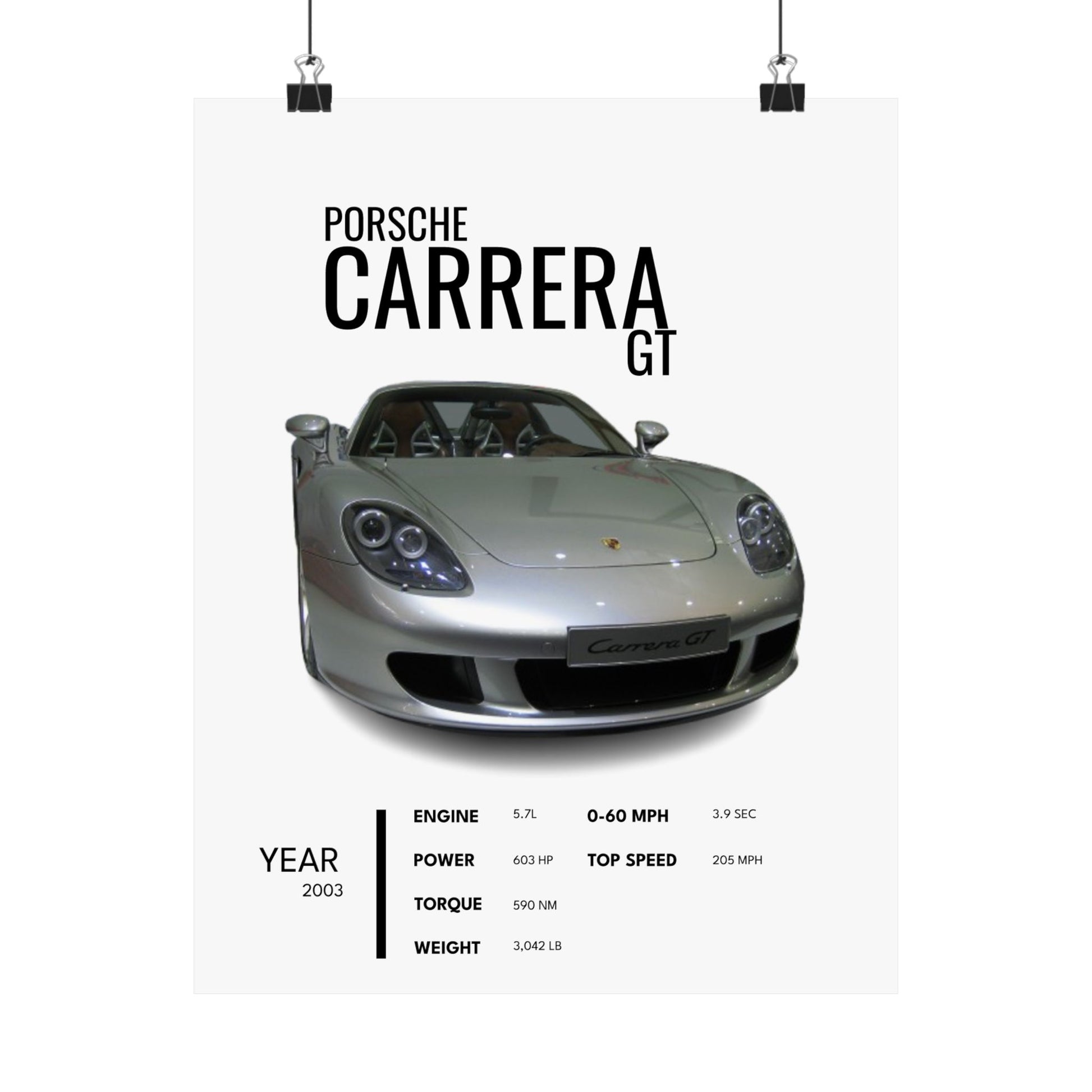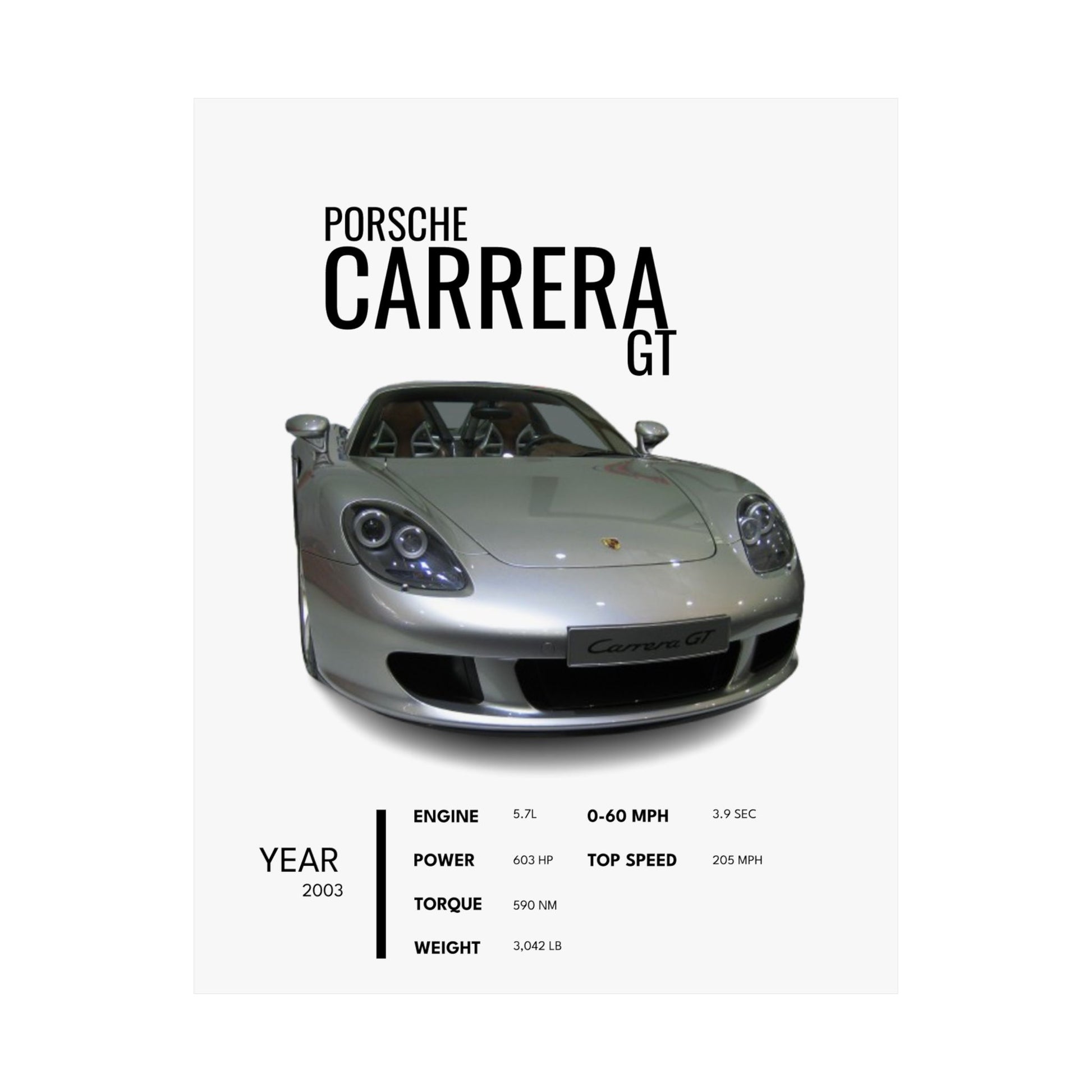 Add a touch of style to your space with this stylish 2003 PORSCHE CARERRA GT poster. Perfect for car enthusiasts and art lovers, this satin poster is vibrant and durable, adding a pop of color to any room. Ideal for hanging in a garage, man cave, or office, this poster is a must-have for car lovers and collectors. Great for birthdays, Father's Day, or as a gift for any special occasion.