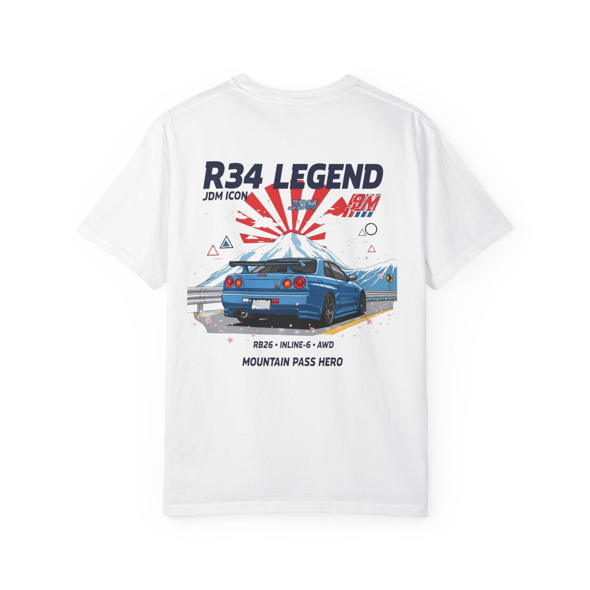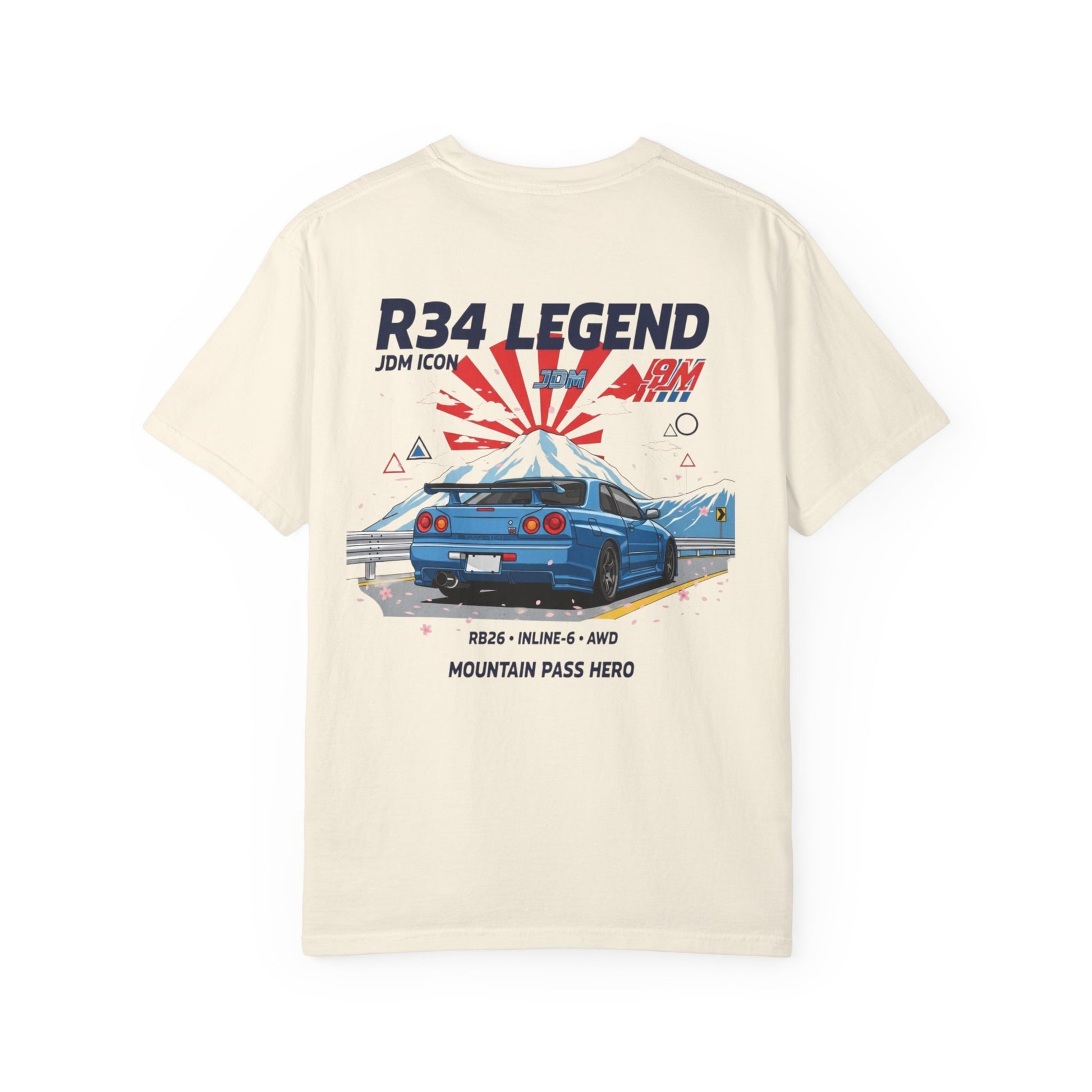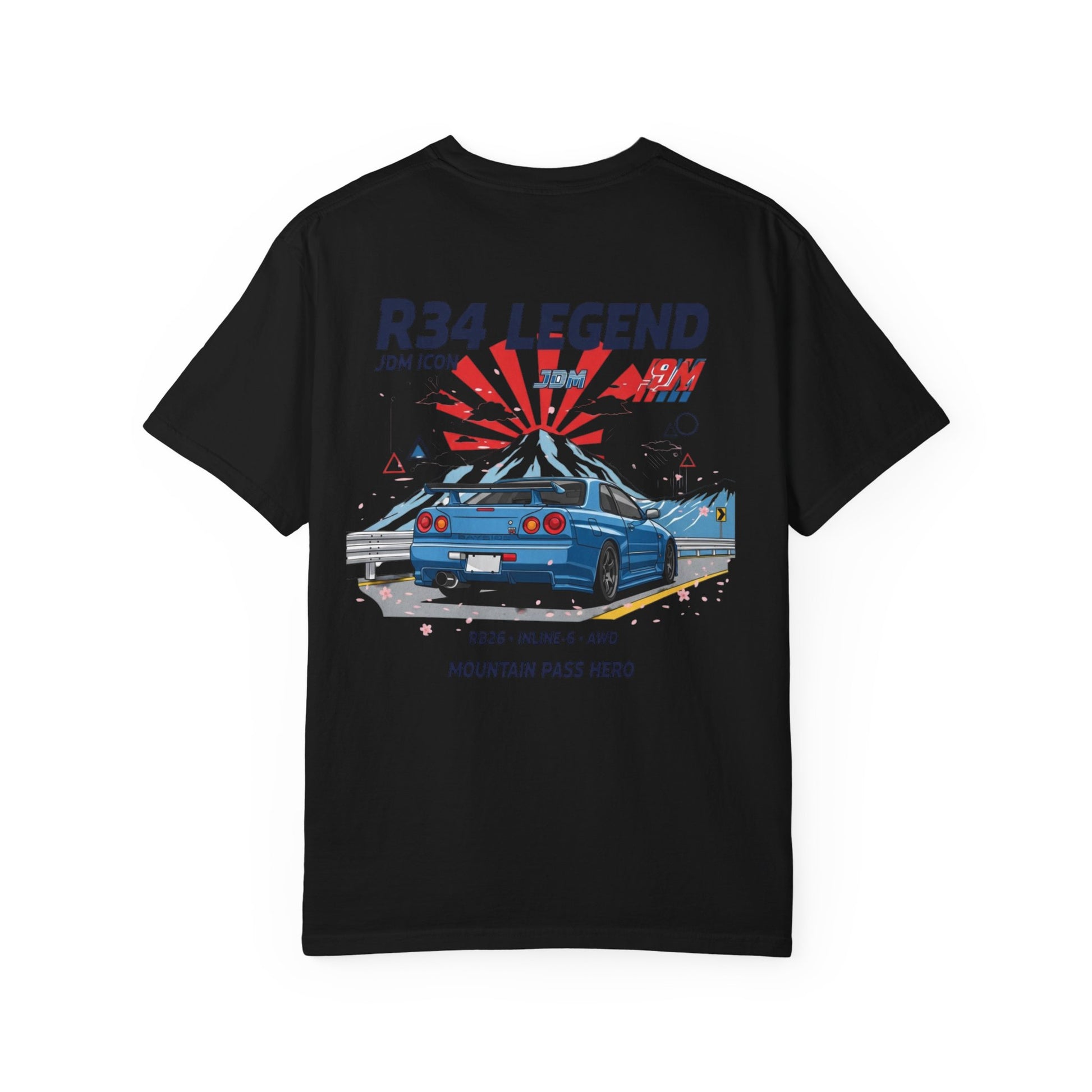 Vintage JDM R34 Legend T-Shirt with a graphic design, perfect for car enthusiasts. This unisex tee offers a relaxed fit and is made of 100% cotton for lasting comfort. Ideal for those who appreciate vintage cars and want a unique addition to their wardrobe. Perfect for car shows, automotive events, and casual wear.